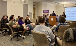 Participants discussed how many political views are often shaped by one’s religious views. Audience members considered how democracy might result in government policy that follows the doctrine of the most prevalent religious view. Speakers discussed ideas ranging from abortion, same-sex marriage, welfare, and taxes.