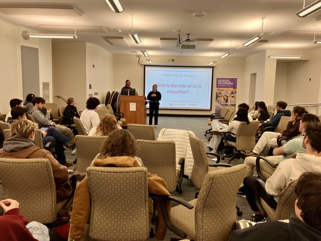 On February 23rd, the CSFE cohosted a campus discussion, along with Braver Angels and College Debates & Discourse Alliance, on the role of AI in education. Students presented the benefits and draw backs of using AI inside and outside the classroom, whether AI should be limited by age or type of assignment, how AI affects the environment, and how the usage of AI might alter how brains form and function