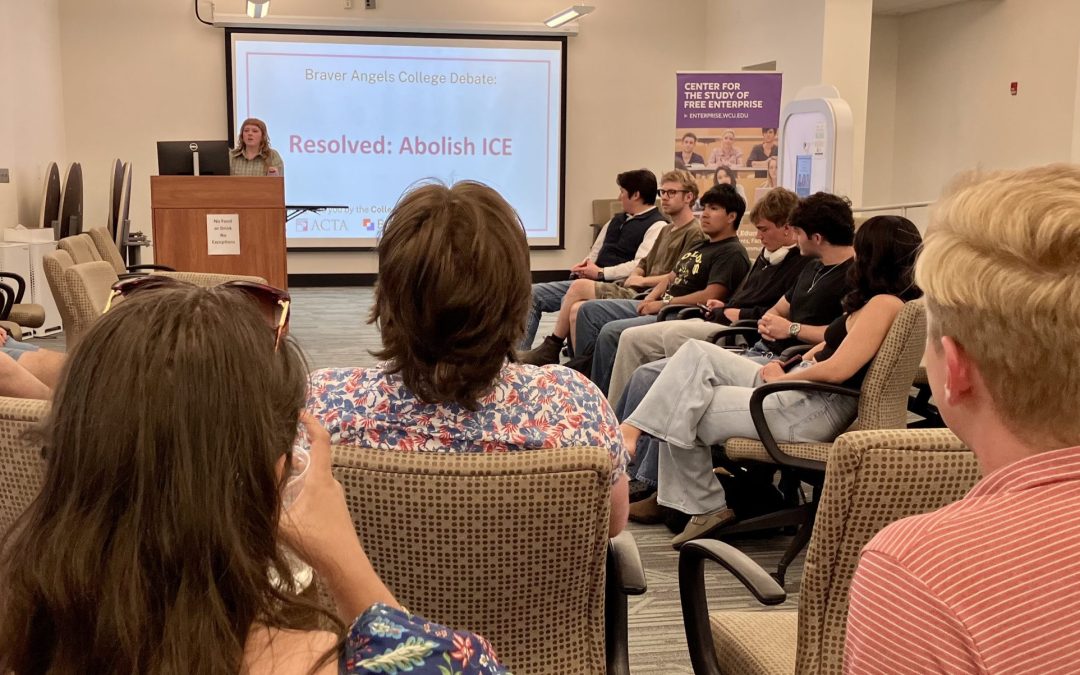 Facilitating a debate on such charged topics requires an excellent team of Barnes Debate Fellows. Ashlyn Hannon was our outstanding chair. She ensured that audience members respectfully listened to every speaker and that audience members were given ample opportunity and time to ask questions of each speaker. Lazarus White and Tryston Weiss encouraged audience members to present their ideas about ICE and ways to move forward. The CSFE also thanks Mae Rum, Melanie Lewis, Whitney McCall, and Brynne Murphy for making the event a success. The debate was cosponsored by Braver Angels, Bridge USA, and the College Debates and Discourse Alliance with support from the Barnes Family Foundation.
