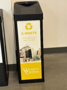 Acceptable items include batteries, printer cartridges, electronics, and cords. Bins can be found in the Health and Human Sciences Building, Stillwell, Apodaca, the University Center, Hunter Library, Forsyth, and Belk.