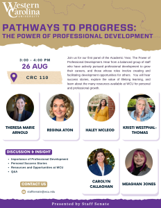 Join us for our first panel of the Academic Year, The Power of Professional Development. Hear from a balanced group of staff who have actively pursued professional development to grow their careers, and those whose roles involve creating and facilitating development opportunities for others. You will hear success stories, explore the value of lifelong learning, and learn about the many resources available at WCU for personal and professional growth.